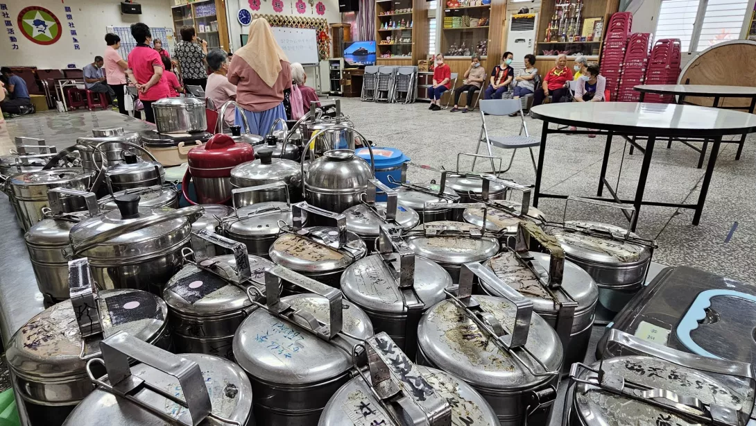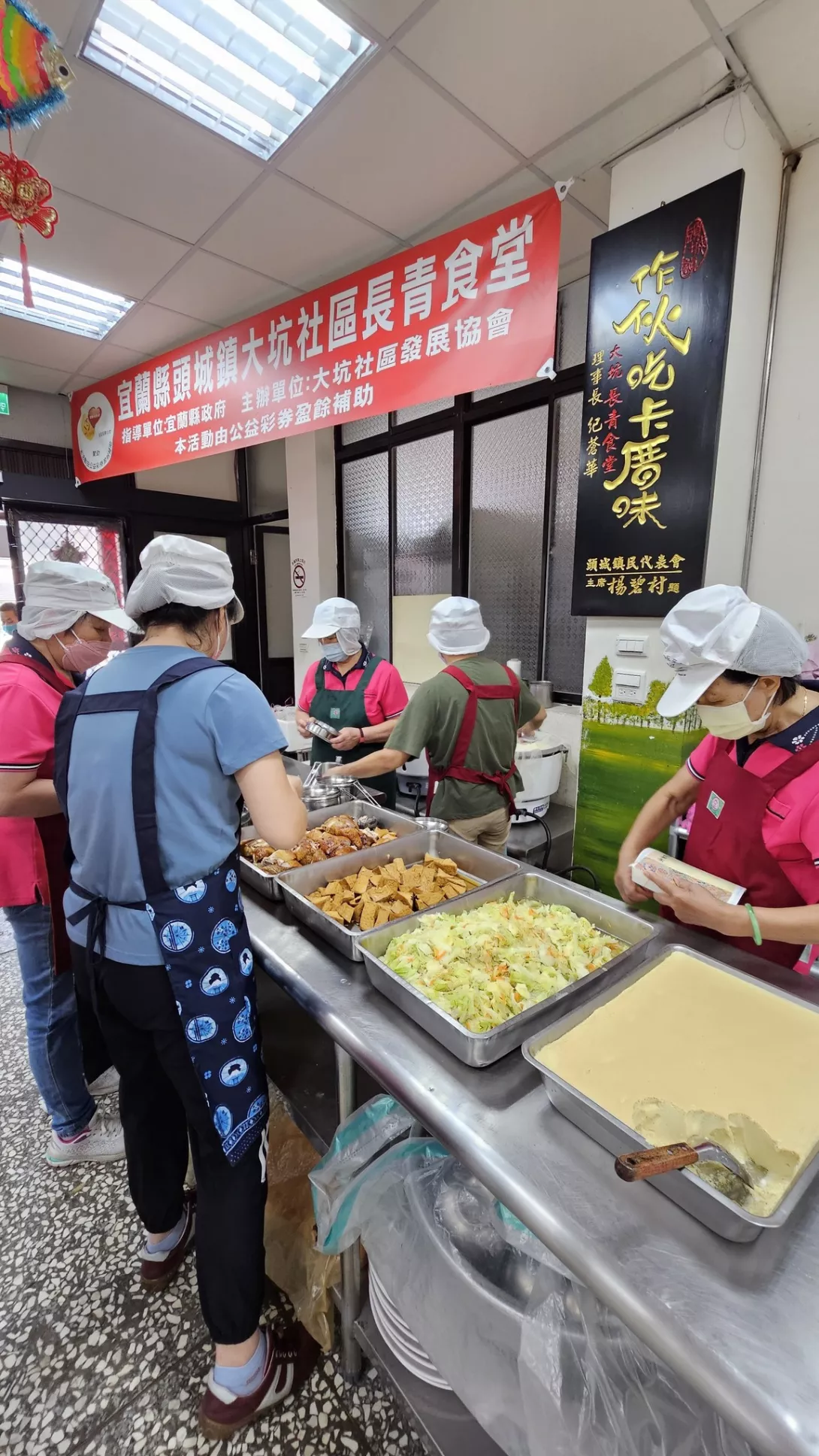 走進大坑罟社區活動中心,近門的桌上擺滿貼著名字的鐵盒便當,牆上掛著長青食堂的紅色布幅,還有『作伙吃卡厝味』的牌匾,旁邊兩張圓桌,已有長者在此休息等候用餐,廚師烹煮好的菜餚依序端出,多位志工忙著盛飯、打菜、裝便當盒,每日有七十幾個人受惠於關懷據點的服務。