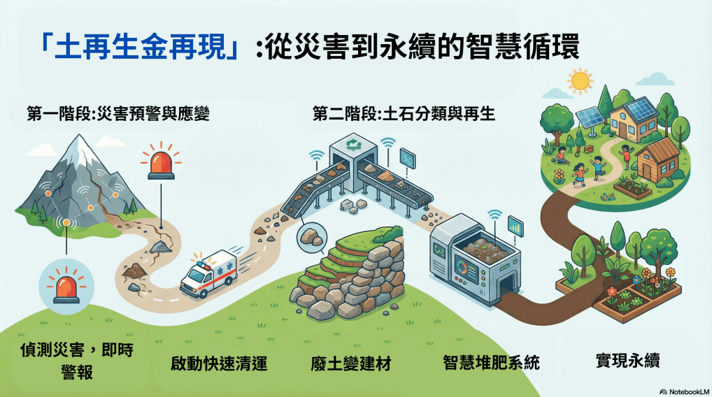尖石鄉地處山區,極易遭受地震與土石流威脅。每當災害發生,大量土石被沖刷而下,傳統做法是以挖土機將這些廢棄土石挖走丟棄。然而,如何將災後產生的碎石、沙土與樹枝等殘餘物進行回收與循環再利用,成為當地亟待解決的環境問題。這也促成了「土再生金再現」系統的誕生——透過智慧堆肥技術,將災害廢棄物轉化為可用資源,實踐環境永續的理念。
