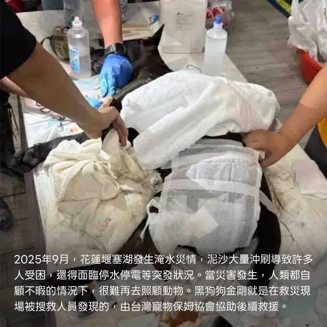 2025年9月,花蓮堰塞湖發生淹水災情,泥沙大量沖刷導致許多人受困,還得面臨停水停電等突發狀況。當災害發生,人類都自顧不暇的情況下,很難再去照顧動物。黑狗狗金剛就是在救災現場被搜救人員發現的,由台灣寵物保姆協會協助後續救援。