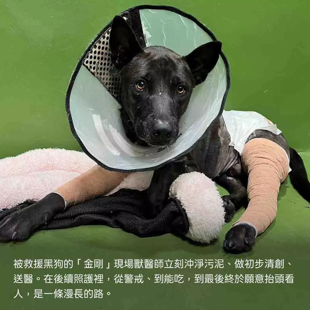 現場獸醫師立刻沖淨污泥、做初步清創、送醫。在後續照護裡,從警戒、到能吃,到最後終於願意抬頭看人,是一條漫長的路。
