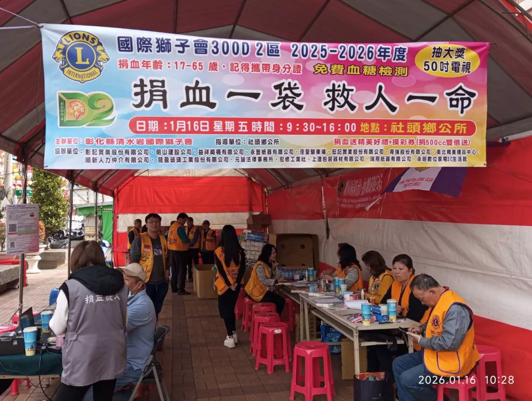為紓解國內血庫存量壓力及穩定醫療用血需求,今日由清水岩獅子會發起響應捐血活動,(16)日上午9時30分起即於社頭鄉公所前廣場辦理捐血做愛心活動,號召鄉親好朋友一起挽袖來捐血《捐血一袋,救人一命》做公益。