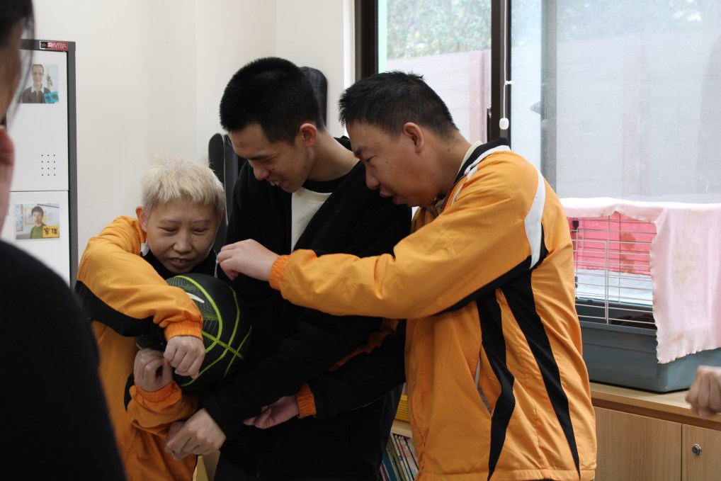 ↑教保員龍梅梅教導院友們一起玩團體合作遊戲。攝影/張梓豪