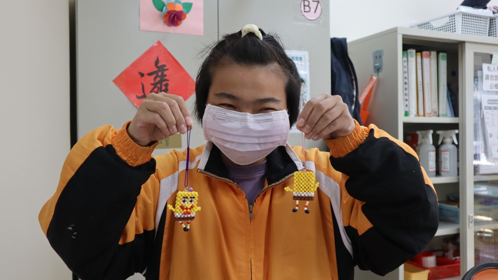 ↑院友婉娟展示她親手串好的串珠。攝影/池亮庭