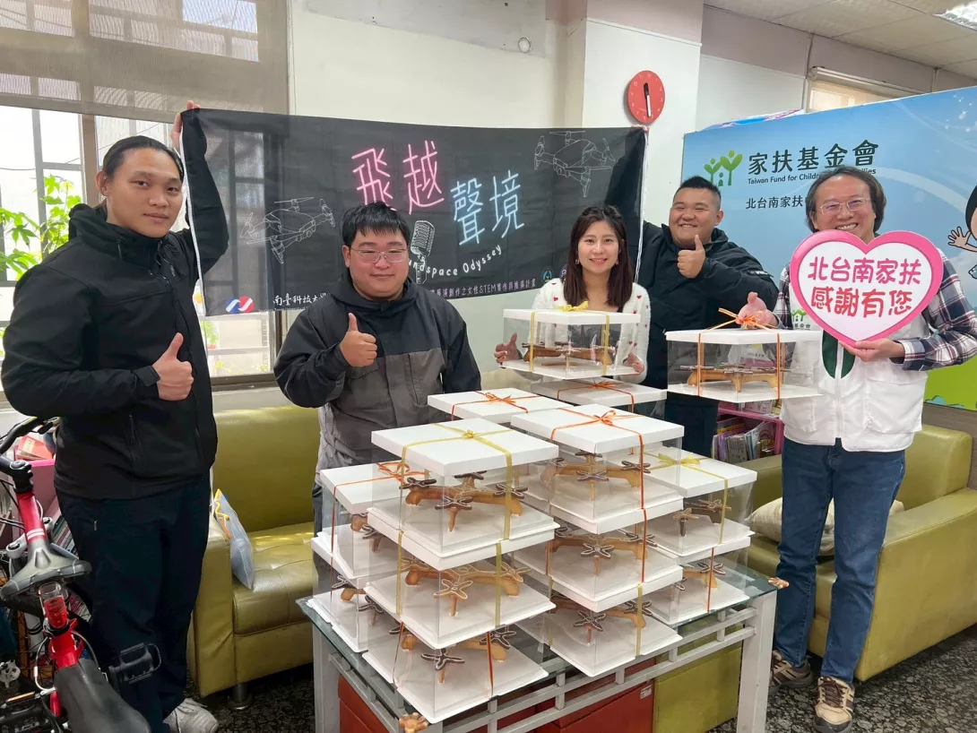 計畫主持人黃玉君老師(中)帶領學生團隊,將親手製作的無人機餅乾致贈予家扶中心北台南辦事處,落實大學社會責任(USR)與溫暖傳遞。