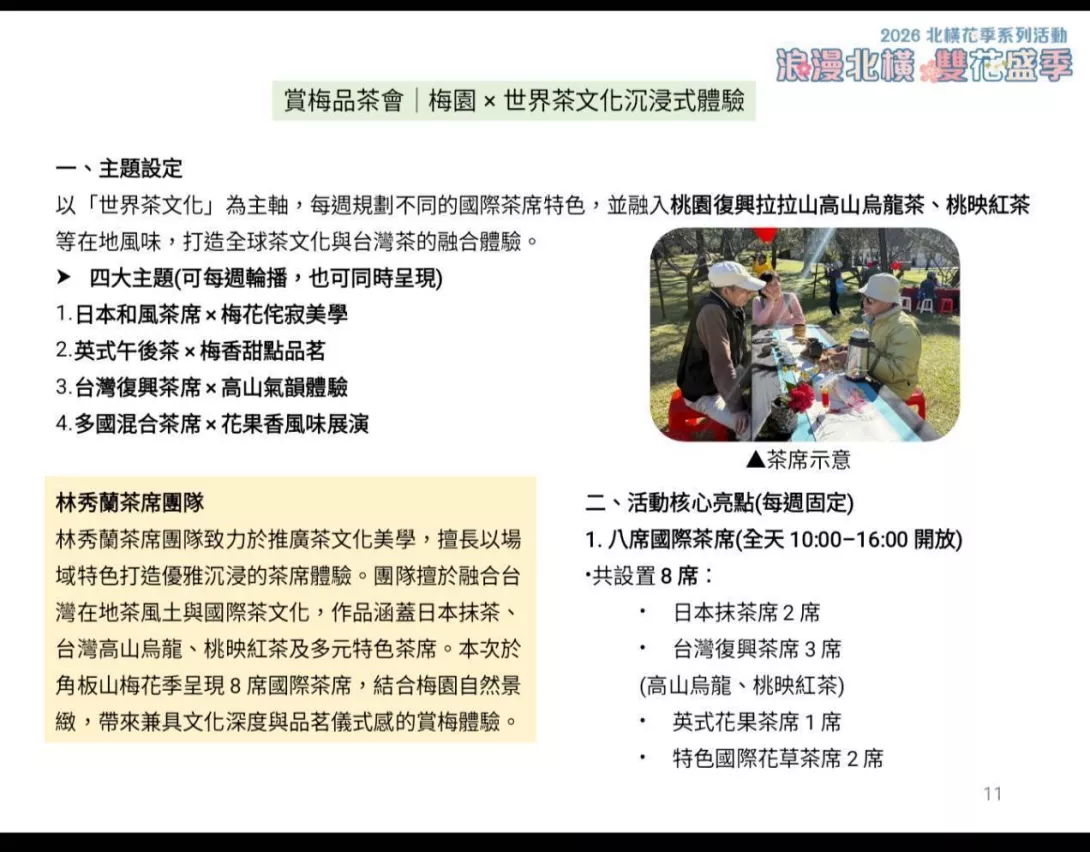 2026年1月17日首先登場,再來是1月18日,1月24日及1月25日,共有4場地點為角板山行館公園內梅園。