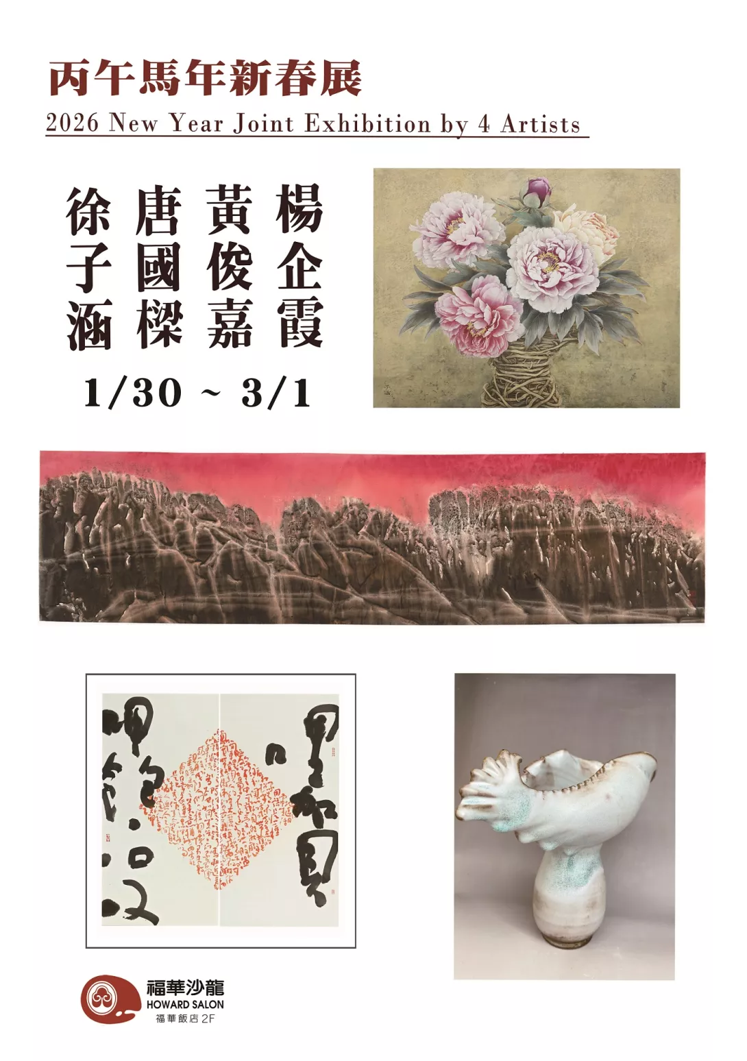 迎接丙午馬年新春,福華沙龍將於2026年1月30日至3月1日推出「丙午馬年新春展」,邀集楊企霞、唐國樑、徐子涵與黃俊嘉四位藝術家聯袂展出。