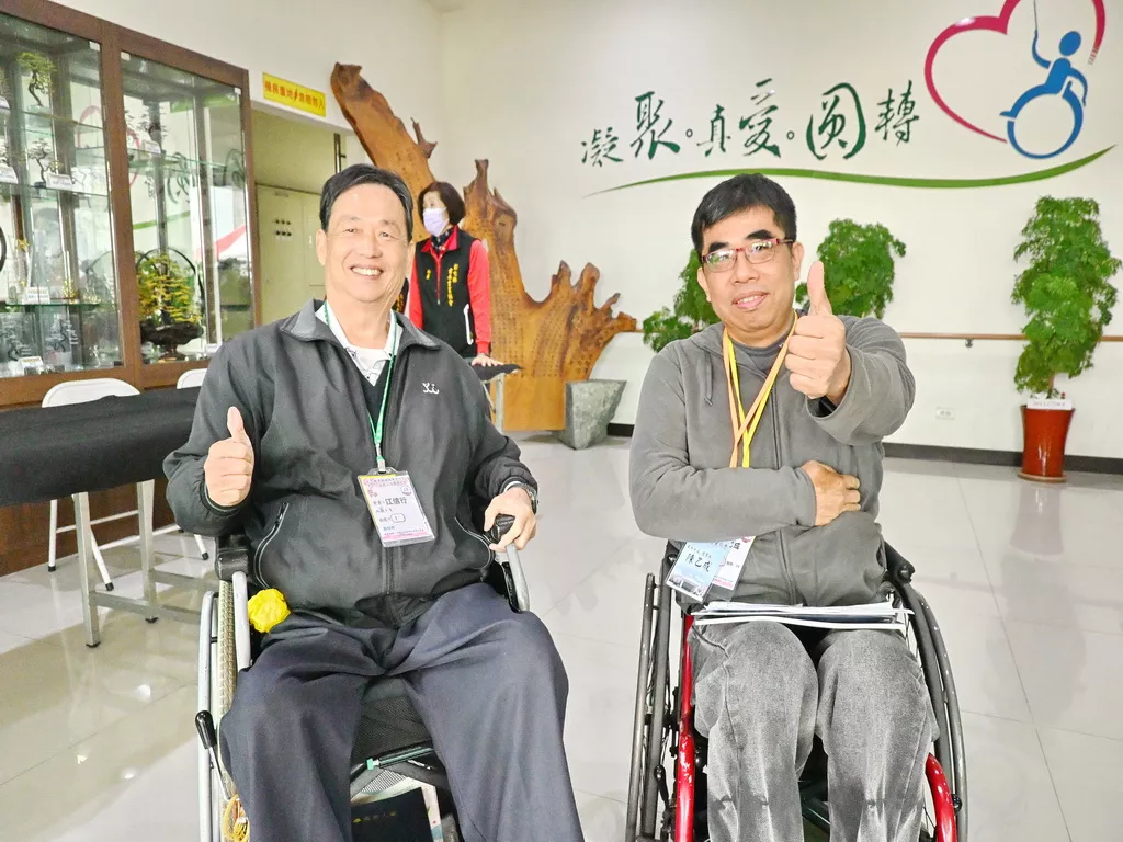 ▲春節前舉辦會員大會,彰化縣脊髓損傷重建協會理事長陳乙成(圖右)、執行長江信行(圖左)歡迎會員回娘家。(圖/記者周厚賢攝)