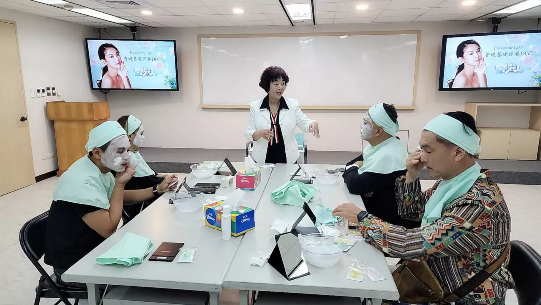 講座現場安排完整臉部保養流程示範,包含基礎清潔、肌膚調理、角質管理與後續保養程序,由專業人員逐步說明操作重點,讓參與者從實際體驗中建立正確的日常保養觀念。值得注意的是,除了女性族群外,現場亦有多位男性到場參與體驗,反映現代男性對於外在管理與健康保養的接受度正明顯提升。