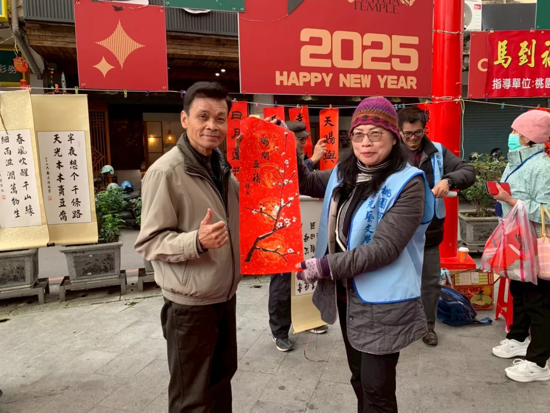 桃園市榮光藝文學會理事長黃日政表示,今天老師們現場揮毫贈送春聯,具有濃濃的客家味,國語、客語春聯民眾都很喜歡,也更有過年的氛圍。劉玉梅老師現場畫梅花配合寒流到來,真的是「梅花梅花越冷越開花」。