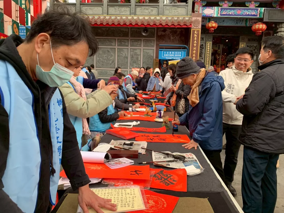 115年2月8日下午桃園市榮光藝文學會,在龍元宮廟前廣場舉辦名師揮毫:馬到福來贈春聯暨客家獅頭藝術展示活動,參觀民眾免費領取喜歡的春聯,同時讓傳統工藝糊紙獅頭走入大廟埕。市議員徐玉樹、張肇良特別謝謝老師們在寒流來襲中帶來溫暖的年味和祝福。