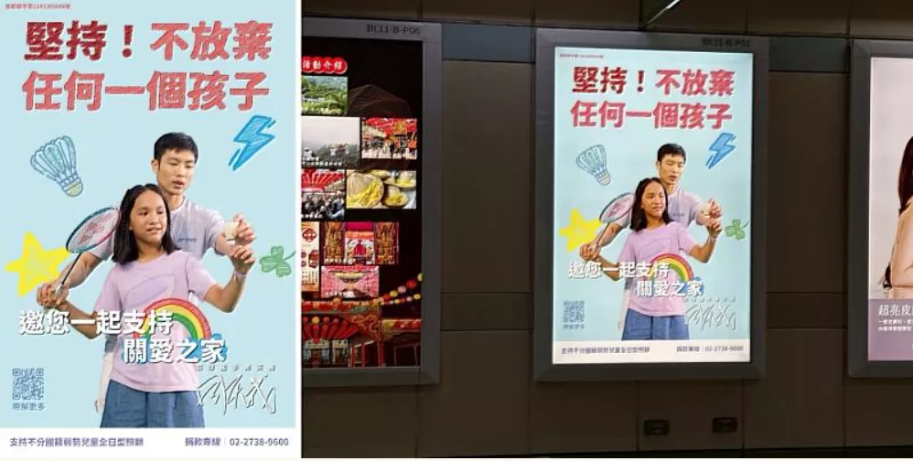 此次燈箱畫面邀請羽球國手周天成親自示範陪伴孩子學習羽球的溫馨互動,以真實情感詮釋「陪伴、引導、不離開」的核心精神。畫面簡潔卻深具感染力,象徵基金會多年來始終如一的信念——無論孩子的家庭背景、國籍或生命處境,都應獲得妥善照顧與支持,在成長路上不被遺落。