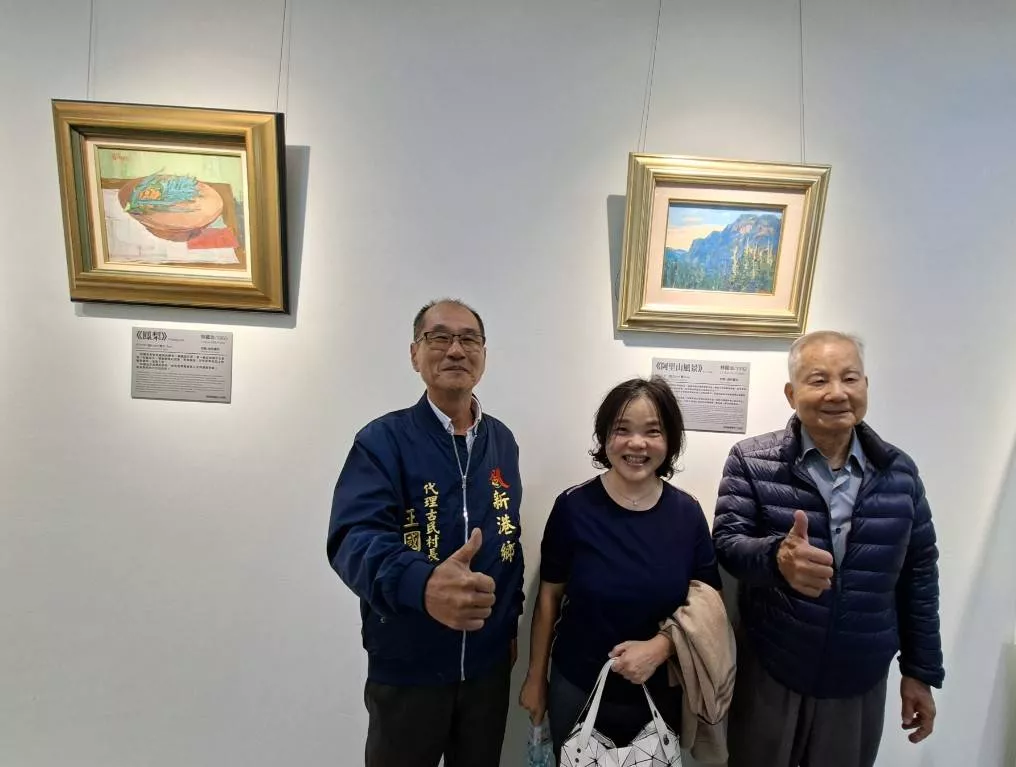 (左新港鄉代表,林國治美術館林虹昱董事長,新港前鄉長縣府顧問鄭田村。在公所二樓藝術空間-林國治老師畫作前。記者林慧茹)