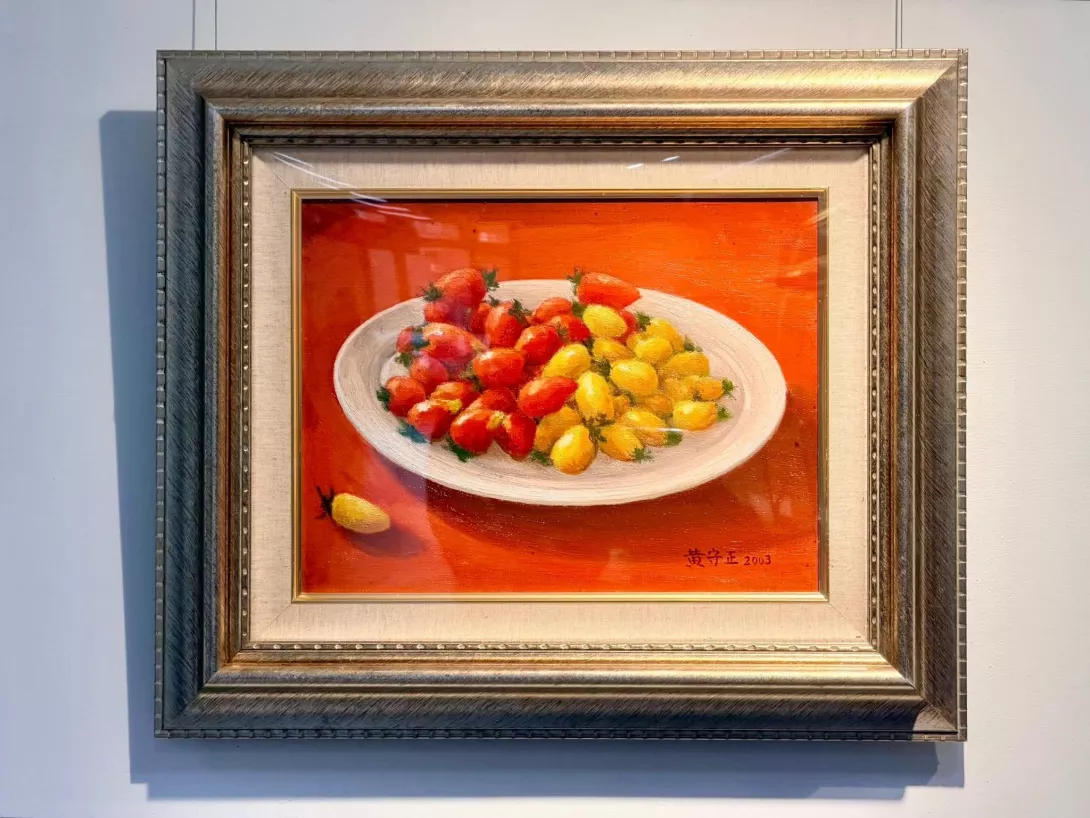 嘉義縣新港鄉安和社區所種植的小番茄。畫面中白色盤子盛滿紅、黃相間的小番茄,在鮮紅色背景襯托下形成強烈視覺效果,精准捕捉光影與質感變化,展現藝術家獨特的繪畫語彙。作品不僅流露創作當下的生活滿足與喜悅,也體現對鄉土人文的深厚情感與關懷。
