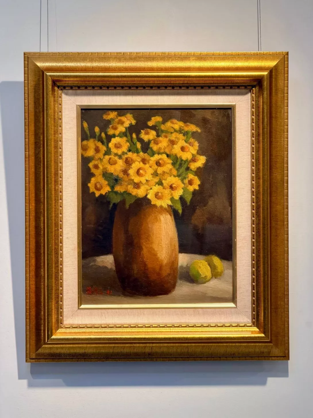 畫作小雛菊畫面以左側瓶花為視覺焦點,右下兩顆柳丁平衡構圖。黃色小雛菊在深色背景襯托下更顯明亮鮮活。整體色彩溫暖而寧靜,傳達和諧、喜悅與充滿生命力的氣息。強烈對比不僅展現藝術家深厚的構圖功力,更流露他到自然與生命的熱愛與讚頌。