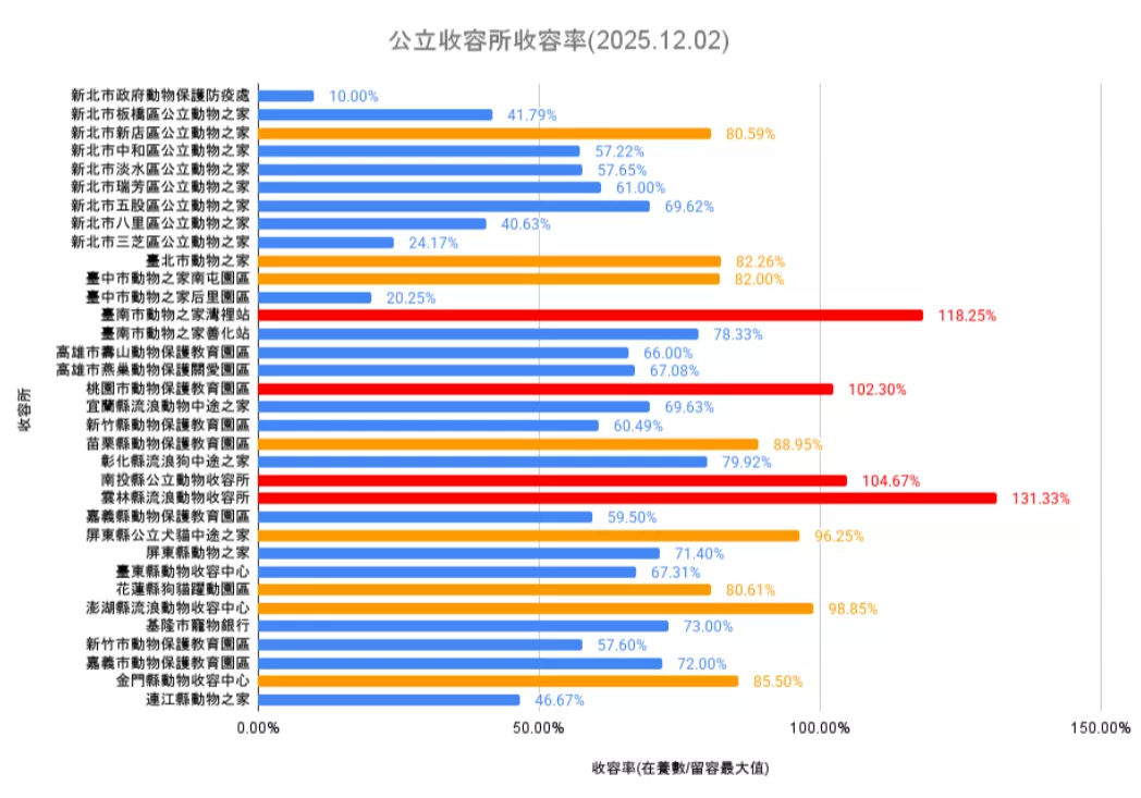 自從「12 夜條款」取消後,犬隻在收容所內的停留時間大幅延長;再加上地點有限、人力與經費不足,多數縣市的收容所長期處於「滿載」狀態。願意收,也收不進;勉強收了,環境又難以維持。從全國動物收容管理系統中整理出的圖表也可見,不少收容所長期維持在 80% 以上(橘),甚至有縣市超過 100% 的飽和狀態(紅)。