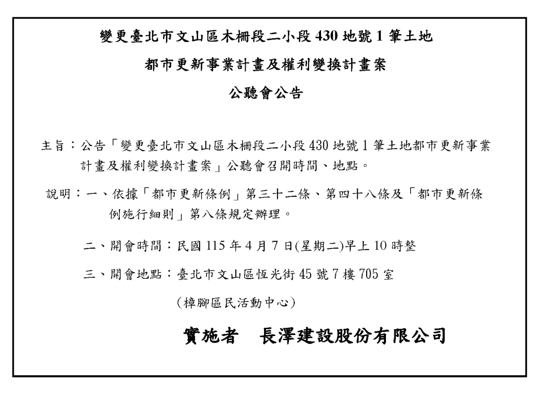 臺北市文山區都市更新邁向新階段。實施者長澤建設股份有限公司今日宣布,針對「變更臺北市文山區木柵段二小段430地號1筆土地都市更新事業計畫及權利變換計畫案」,將於民國115年4月7日正式召開公聽會,邀請相關權利人共同參與,確保更新計畫符合在地期待。