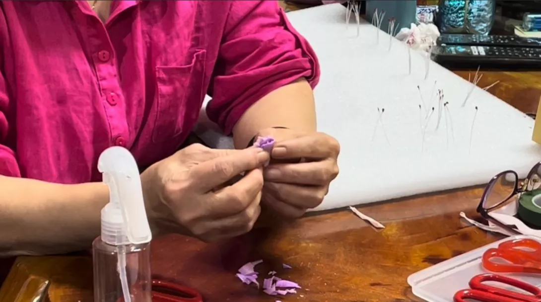 蓪草紙質地極其脆弱,如白翡翠般觸手即碎,過濕則軟、過乾則脆,極度考驗力道的掌控。她常對學生說:「這門技藝說難不難,關鍵在於心能否靜下來。」唯有在平靜與耐心的狀態下,才能與這份脆弱的材料對話,捏塑出理想的花形。對她來說,教學不僅是技藝的轉移,更是一場關於專注力與修心的訓練。