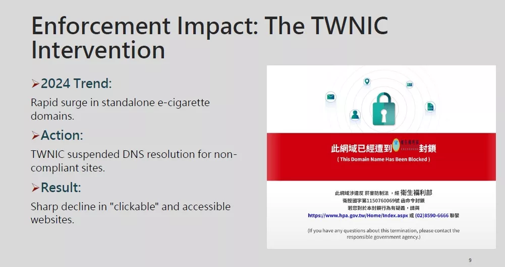 - 技術阻斷: 透過財團法人台灣網路資訊中心(TWNIC)進行「域名封鎖」(DNS封鎖),截至目前已成功攔截 2,015 個海外電子煙網站。