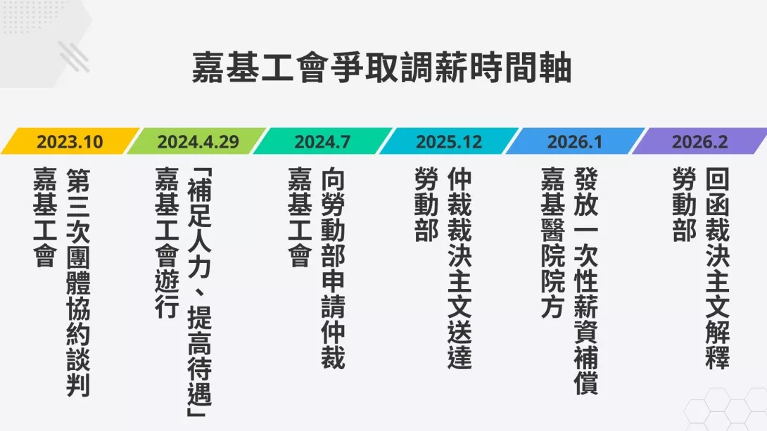 嘉基工會主張,根據裁決主文調薪方案已於2023年10月生效,後續2024年10月至2025年12月共14個月之薪資也應盡速補發。而在2026年1月的1000元調薪,不足主文所提及的1200元,院方應盡速調整。