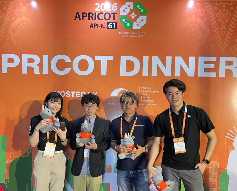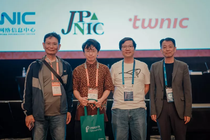 ▲【領航之姿】 APNIC 執行委員會主席黃勝雄(右一)、楊金時(右二)與南臺科大林韋成(左二)及 TWNIC 葉信源工程師合影,展現臺灣在國際網路治理的關鍵參與。