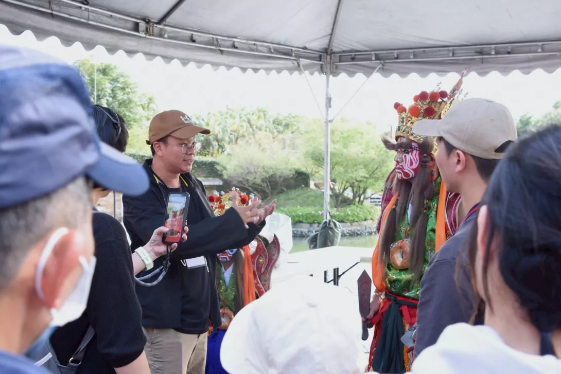 ▲透過現場深入解說官將首裝備與法器意涵,社團以面對面交流的方式,讓民眾更進一步認識傳統陣頭文化。