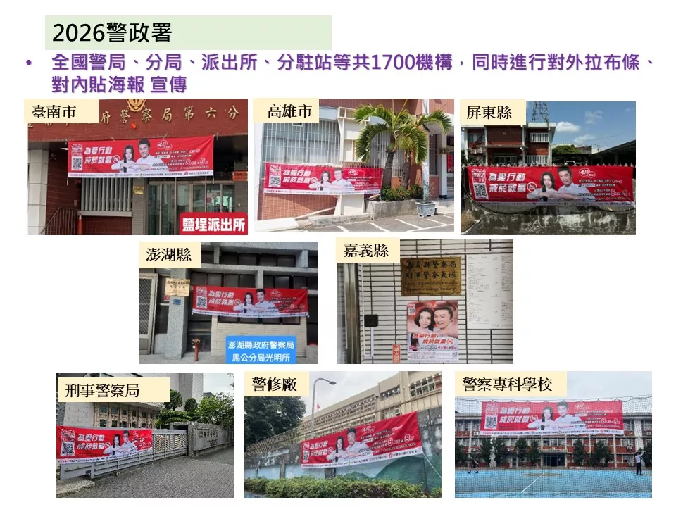 為促進7.5萬名警務人員(含警校生)及其家庭更健康圓滿,「2026戒菸就贏比賽」警政署再加碼「警務人員成功戒菸專屬獎」(8萬元2組),即警察同仁,除可抽全國成功戒菸獎項外,還可以抽警察同仁專屬的獎項。同時,全國1700個警局、分局、派出所、分駐站一起懸掛布條、張貼海報、運用跑馬燈等宣導,合力推動助人戒菸、宣導戒菸就贏。