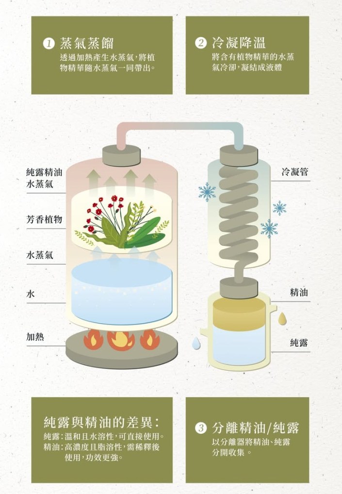 經過冷凝與靜置後,收集到的液體會自然產生油水分離:不溶於水且密度較輕的脂溶性成分會浮在上層,這便是高濃度的精油;而下層飽含水溶性植物精華與微量香氣分子的水分,則是溫和的純露。