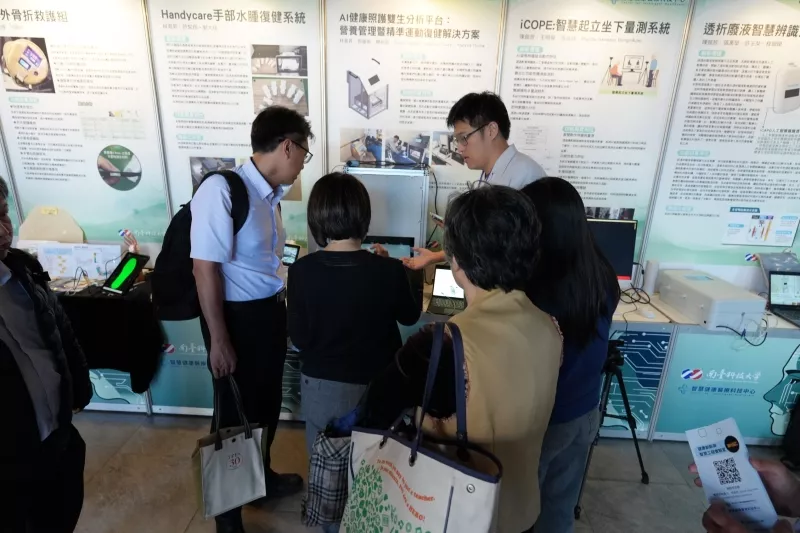 ▲【「2026智慧健康醫療論壇」現場特別規劃技術展示與媒合區,由南臺科大師生研發團隊親自向與會的產業界代表解說創新作品。】