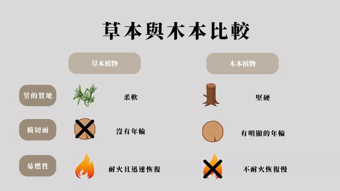 草本與木本植物在構造上的差異,反映出兩者截然不同的生長特性。【記者 李虹誼/製圖】