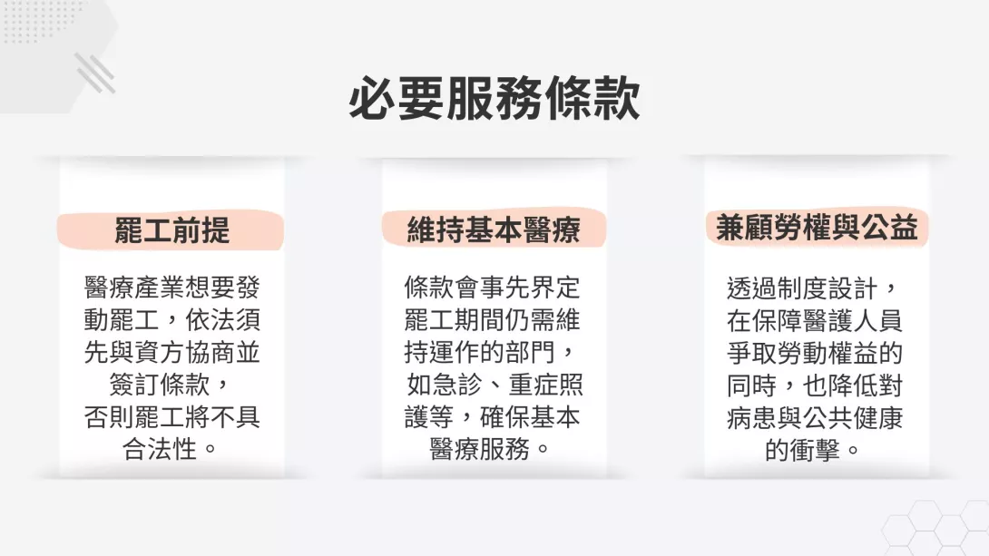 簽訂必要服務條款後,醫療工會可合法進行罷工,增加談判籌碼。【記者 鄭羽婕/製圖】