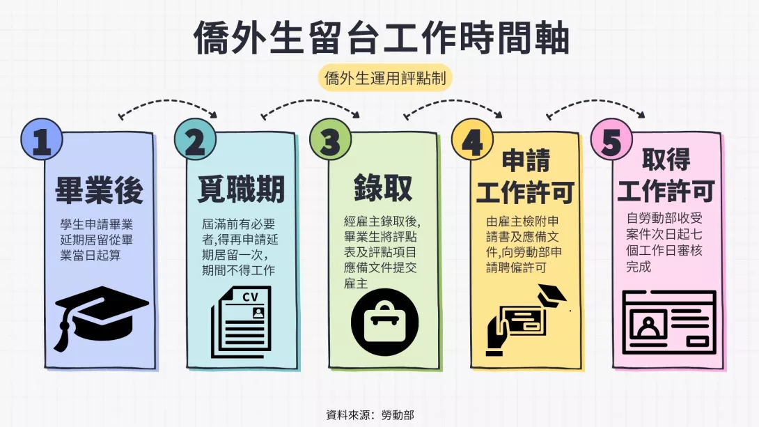 <註二>僑外生留台工作評點制:是勞動部專為在台畢業的外國學生(僑生、港澳生、外籍生)設計的工作申請機制。不同於單靠高薪門檻,評點制納入學經歷、實習經驗、語言能力、特殊專長等八大項目,只要總分達70分(滿分200分),即可獲准留台從事專門性或技術性工作,不再受以往年度配額上限限制。