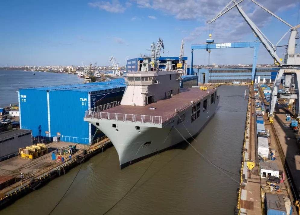 葡萄牙首艘無人機母艦「若昂二世號」在位於羅馬尼亞的造船廠下水。(圖片取自葡萄牙海軍FB)