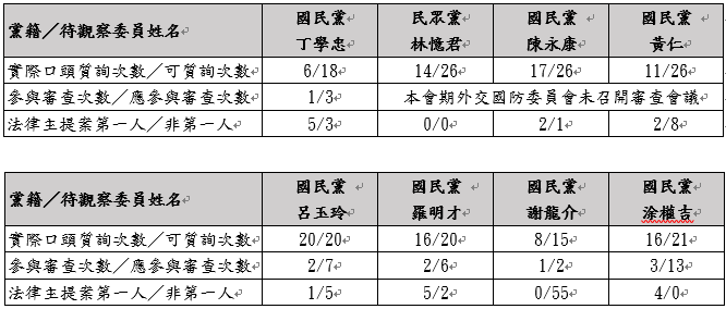 立法院十一屆第四會期待觀察立委與所屬委員會比較表