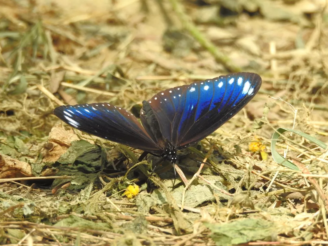 昆蟲生態專家 余弘恕老師:「在那邊有,這叫斯氏紫斑蝶,它正確名稱叫紫斑蝶,牠以前的名稱就叫紫斑蝶,斯氏就像剛剛講的,因為牠亞種名叫斯文豪,斯文豪如果有在注意生物的話,斯文豪是一個很有名的英國人,然後他發表了臺灣很多很多動物,斯氏紫斑會比較大一點,然後端紫斑會長一點,端紫斑翅膀會再長一點,所以這一隻就是在這邊繞,表示這邊我剛剛講的,牠會在那邊繞,表示這邊有什麼,有食物有武靴藤,其實這邊很多我剛剛講過,邊邊很多都是武靴藤,邊邊很多所以,到了六月真的可以看到,滿天飛的斯氏紫斑蝶,剛剛飛過去遷移的行為不一樣,牠這邊找的地方就是產卵,因為剛剛看到很多武靴藤,表示這邊一定有武靴藤。」