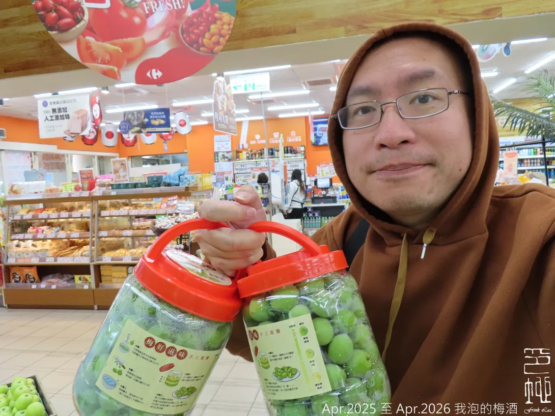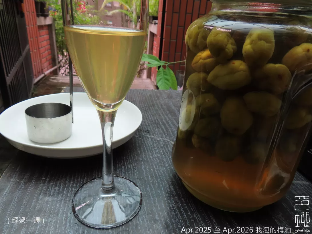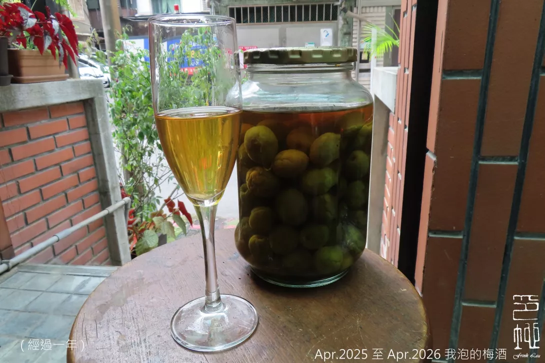 2025 年 4 月初我在家樂福看到有賣桶裝青梅,於是買了兩桶回家泡梅酒,我把梅子稍微燙過加入黃糖和基酒,這裡我所用的是琴酒,經過一週得到如第四圖的成果,再經過一年,2026 年 4 月 15 日的今天我再打開來試了一下,成果如第五圖,相較去年酒色更深、更柔順醇厚,比起市售的產品酒液更稠也更酸一些