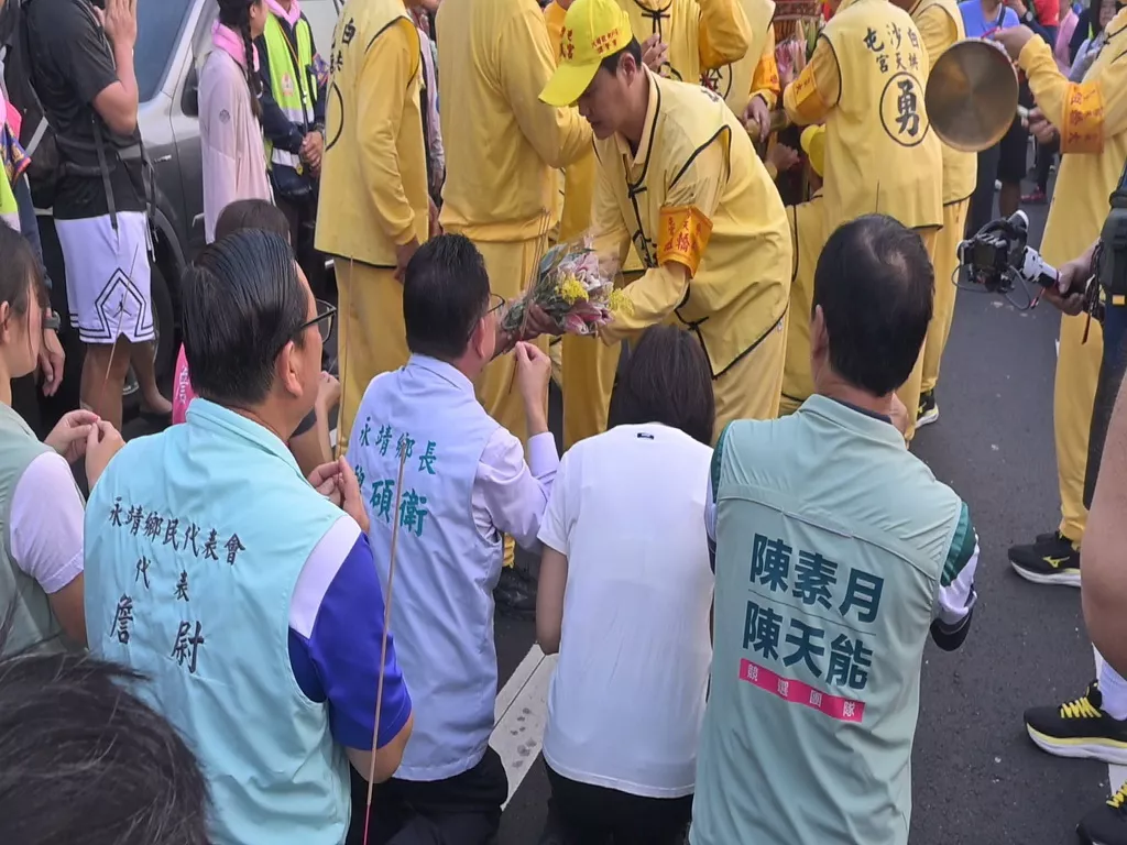 ▲在鑾轎前恭敬下跪獻花,魏碩衛鄉長誠心要讓媽祖感受永靖善信純樸務實。(圖/記者周厚賢攝)