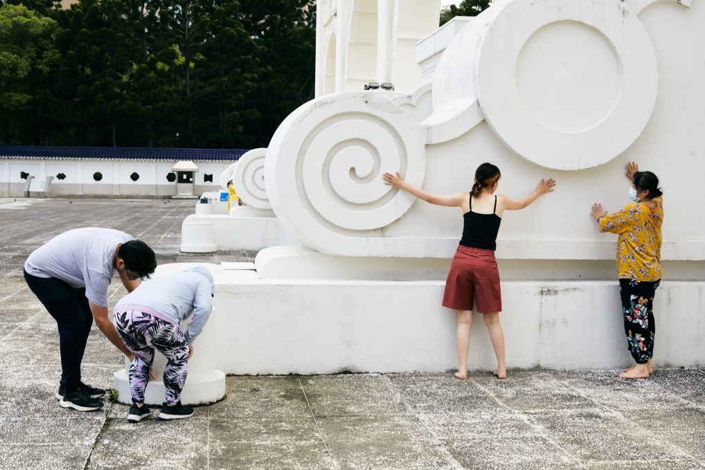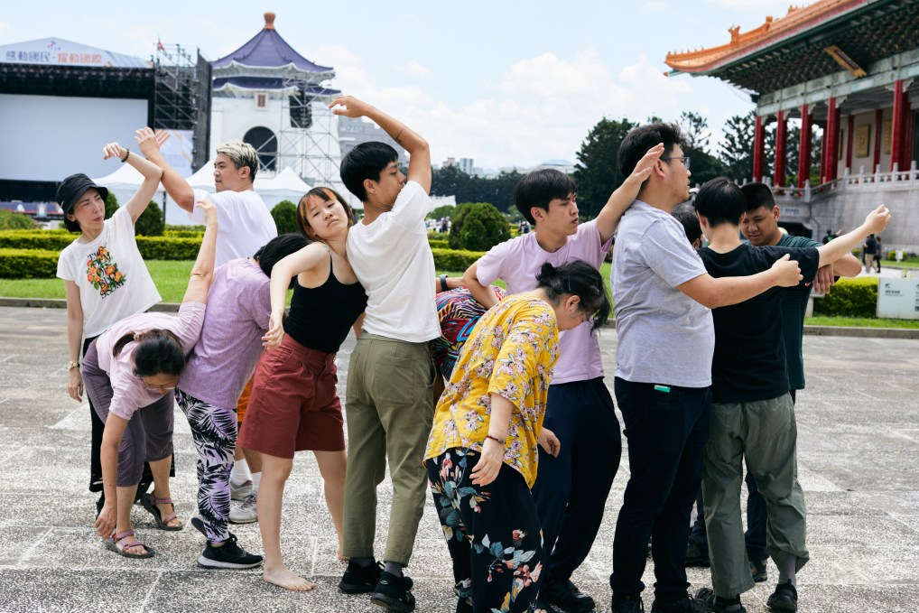 ↑明盲雙方共同探索自由廣場,以觸摸的方式感知空間。照片提供/明盲共舞工作坊