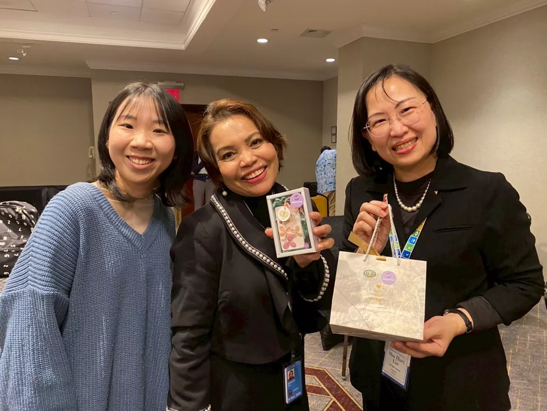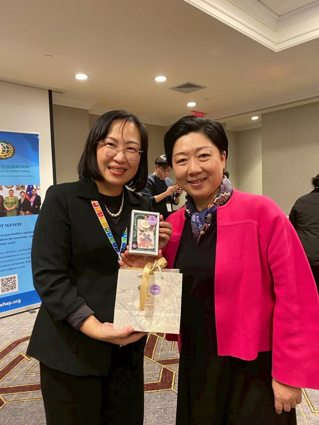 2026年3月世界和平婦女會台灣總會(WFWP Taiwan)秘書長林淑慧與國際事務專員閔彩靖偕同多位優秀年輕女性參與聯合國婦女地位委員會(CSW)周邊的NGO CSW70平行論壇,向國際社會發出台灣女力的聲音。會前,先參與了WFWP國際總會舉辦為期三天的「領導力與倡議力培力工作坊」,在三月八日國際婦女節當天向主辦單位國際會長及WFWP駐紐約聯合國關係辦事處主任等貴賓致贈擴香石禮盒,收到禮品的各國領導人,特別感受到來自台灣女力們的溫暖心意。