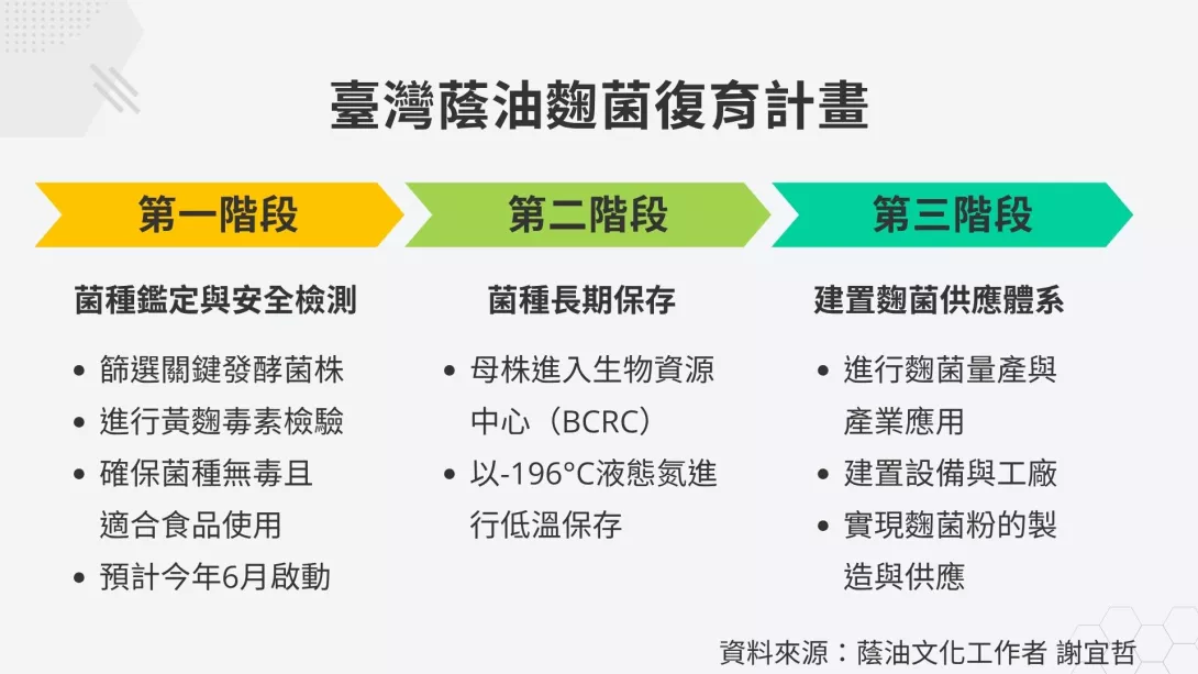 目前復育計畫將分為三個階段推動。第一階段為菌種鑑定與安全檢測,與財團法人食品工業發展研究所合作,預計於今年6月1日起執行菌種分離、純化,並篩選出關鍵發酵菌株,也會同步進行黃麴毒素檢驗,確保菌種無毒且適合食品使用,預計需兩至三個月。