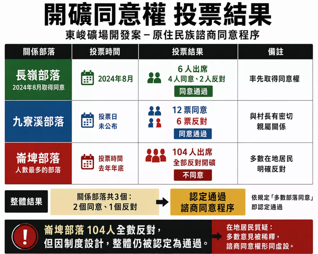 儘管崙埤部落明確表達反對,但由於「關係部落」共三個,其中兩個部落同意、一個反對,最終整體仍被認定為通過諮商同意程序。