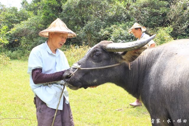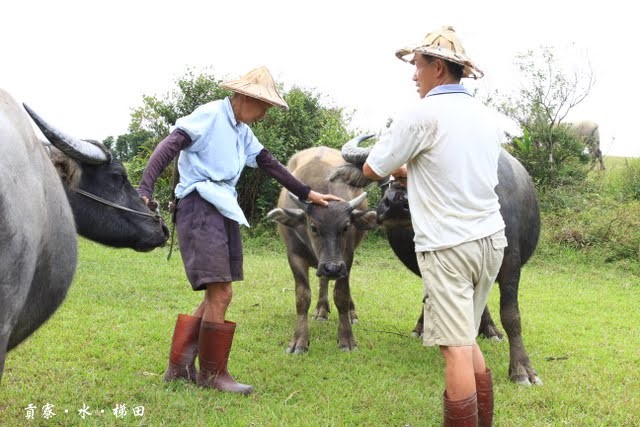 阿伯還說了一個有趣的故事:「牛本來會說話,因為跟主人討麵龜吃,被土地公釘了一根釘子在下頷,才不能講話。所以牛生出來這裡就有一隻釘」阿伯邊和牛玩,邊指給我看,全身灰黑色的水牛下巴還真的有個白色的突起呢!