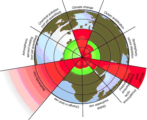 表二列出了九項地球的極限,而依據其分析,如圖一所示,目前在氣候變遷、生物多樣性以及氮循環上,已遠遠超過其限度。而在磷循環與海洋酸化上,亦已逼近限度。至於在空氣污染物以及化學物污染上,雖未見紅色,然其是因目前的科學研究尚難以提供一量化的全球涵容能力值。