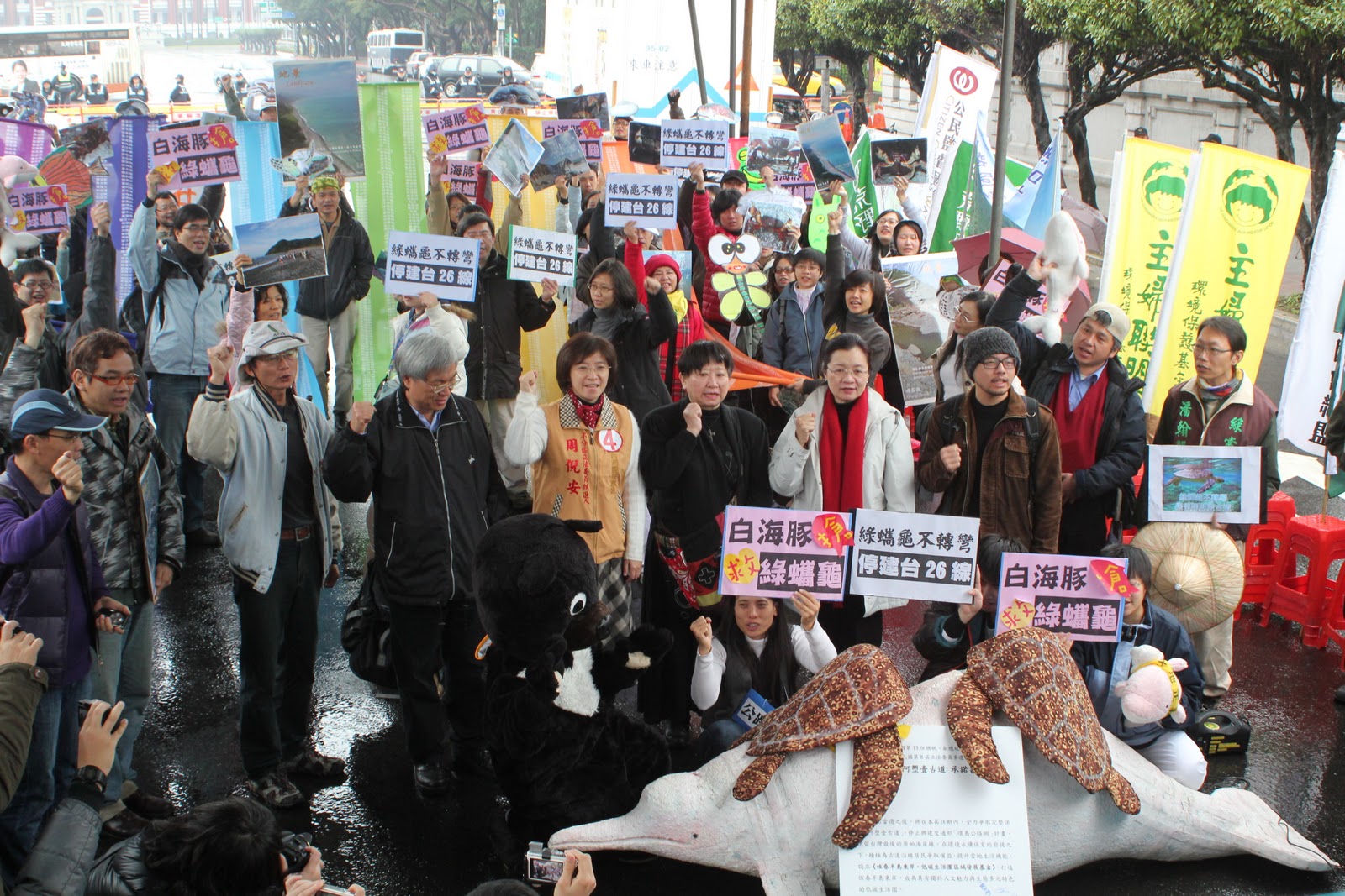 冒著寒風大雨,兩百多位公民與二十多個公民團體走上凱道,高聲呼喊:「停建台26,完整保留阿塱壹古道」,知名導演林正盛、音樂人陳明章也到場聲援。