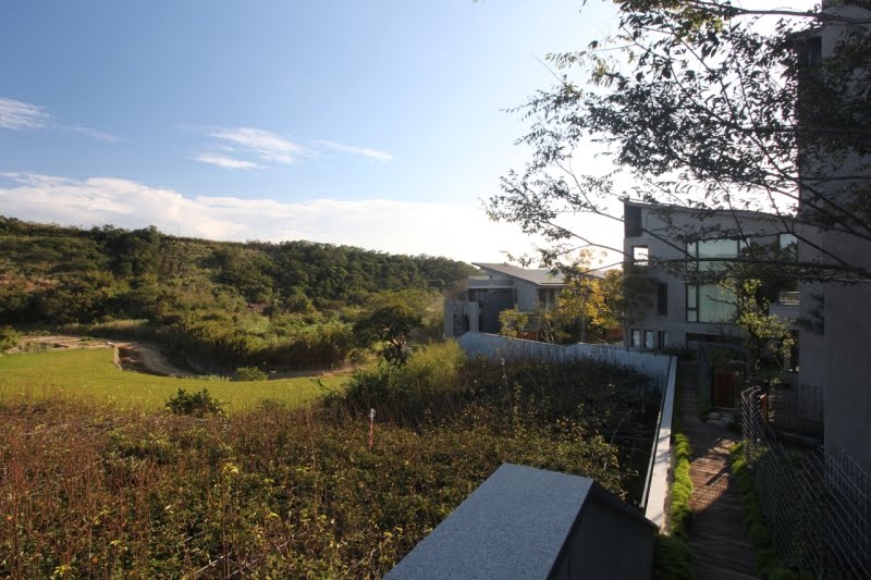 建築師當初在作基地配置時,希望建築物只是配角,退位給更安靜的植物,讓它盡情舒展。房子坐北朝南,斜屋頂的末端作集水槽,回收雨水。房子旁邊開有小孔,應用白努利原理,即使門窗緊閉,還是可利用室內外的正負壓差,將室內的空氣帶出來,強迫換氣。