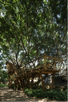 一走出戶外,則又很不情願走回屋裡。社區70%的空地是採透水鋪面,車子會經過的草坪用水庫淤泥燒製的陶粒作60%的土用結構,大喬木再將其餘沒人沒車的空地佔領。人若想在其中休憩則爬上兩層樓高的樹屋,聽風摩擦樹葉悉悉簌簌的聲音,跟跳躍在樹枝間的松鼠打招呼。把手弄髒了,用就地取材的無患子作為肥皂搓出泡沫來洗手。